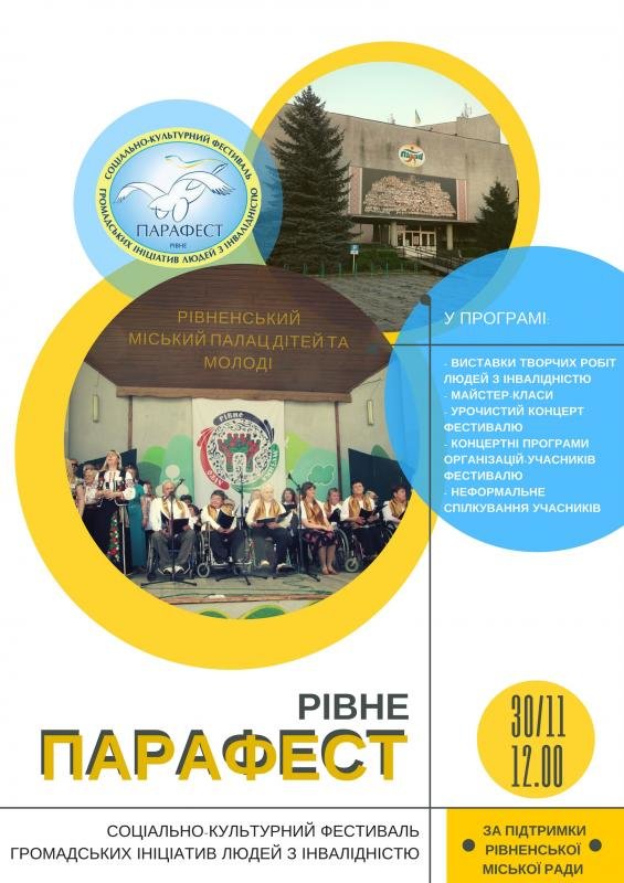 У четвер, 30 листопада 2017 року о 12:00 у Рівненському міському Палаці дітей та молоді (вул. кн. Володимира, 10) відбудеться 3-й соціально-культурний фестиваль громадських ініціатив людей з інвалідністю «Парафест Рівне».