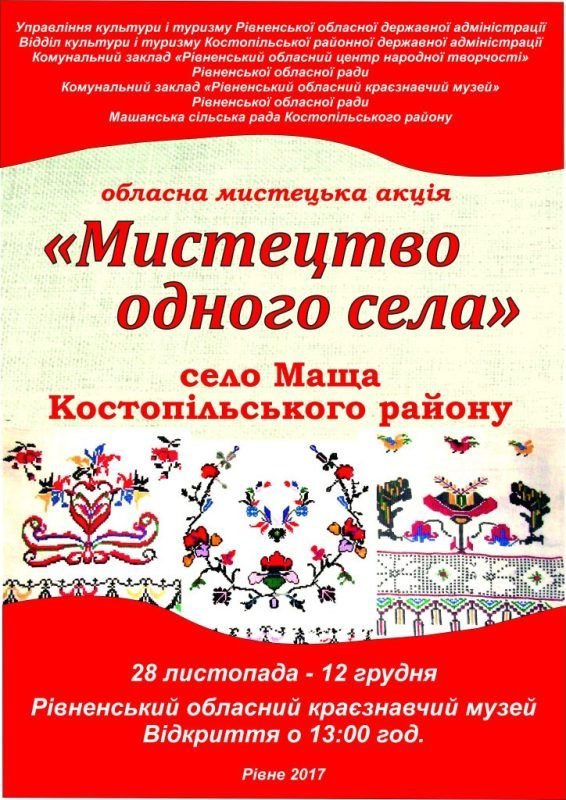 28 листопада 2017 року о 13.00 год. у м.Рівне (КЗ “Рівненський обласний краєзнавчий музей” РОР) відбудеться презентація обласної мистецької акції “Мистецтво одного села” (с. Маща Костопільського району).
