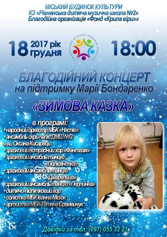 Міський Будинок Культури, Рівненська дитяча музична школа № 2 та благодійна організація "Фонд "Крила віри" організовують благодійний концерт «Зимова казка». Творчі колективи співатимуть і танцюватимуть задля доброї справи - допомоги маленькій дівчинці Марії Бондаренко. Марійка - донька ударника народного аматорського ансамблю народної музики «Наспів» Павла Бондаренка, яка має рідкісне захворювання муковісцидоз. Рівняни не вперше стають пліч-опліч аби допомогти цій світлій дитині побороти труднощі. Цього разу, в переддень святого Миколая, покровителя усіх діток, ми не можемо оминути увагою тих, хто цього потребує найбільше.