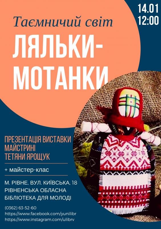 У неділю, 14 січня о 12.00 в Рівненській обласній бібліотеці для молоді (вул. Київська,18) відбудеться презентація персональної виставки Тетяни Ярощук «Таємничий світ ляльки-мотанки». За фахом вона педагог, працює вчителем фізики та астрономії в Рівненському економіко-правовому ліцеї, захоплюється виготовленням ляльок-мотанок.