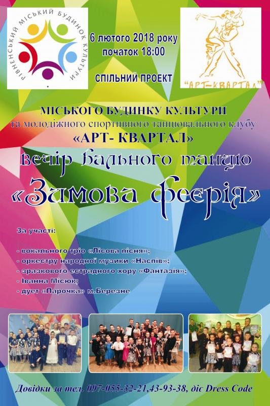 Міський Будинок Культури та молодіжний спортивний танцювальний клуб «Арт-Квартал» готують неймовірну подію – вечір бального танцю «Зимова феєрія». Саме в цьому році клуб святкуватиме своє 10-річчя і тому вирішив порадувати прихильників танцювального мистецтва святковим концертом.