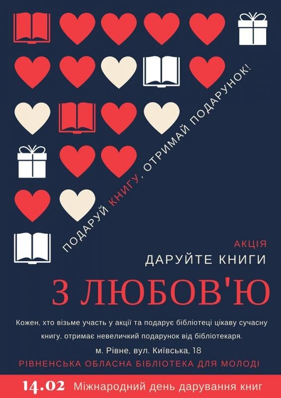 Отож Рівненська обласна бібліотека для молоді запрошує приєднатися до добровільної ініціативи, яка діє у цілому світі і завтра, 14 лютого, прийти до бібліотеки на Київську, 18 і подарувати бібліотеці цікаву сучасну книгу.