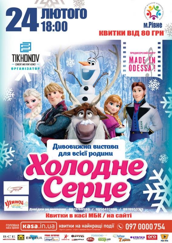 «Холодне серце» - це масштабна постановка від одеського продюсерського центру «Made in Odessa» - неймовірна вистава, створена за мотивами улюбленого однойменного мультфільму дітей всього світу, і самого касового за всю історію компанії «Walt Disney».