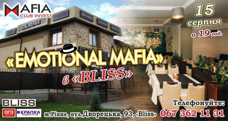 Втомилися? Запрацювалися? Час зняти напругу, відпустити емоції та насолодитися серпневим вечором у хорошій компанії! Запрошуємо на безтурботну "Emotional mafia в Bliss».