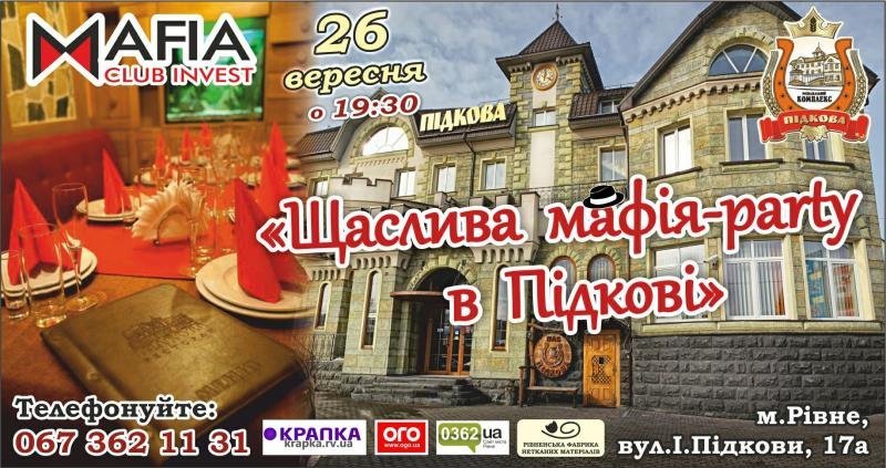 Запрошуємо на «Щасливу вечірку» в Розважально-оздоровчий комплекс "Підкова", де на Вас чекатиме цілий вечір позитиву та улюбленої «Емоційної мафії», безліч подарунків від спонсорів, смачний сюрприз від відтуозних кухарів "Підкови", незабутня фотосесія від мафіозного фотографа у колоритних локаціях закладу.