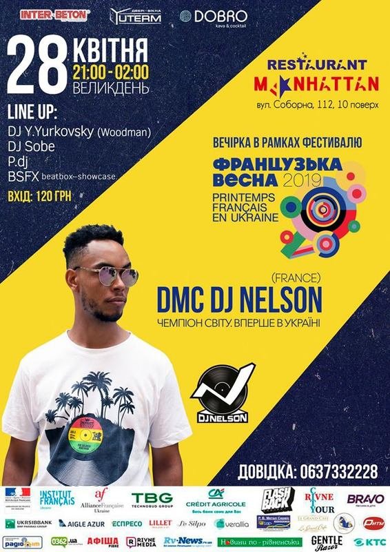 До Рівного їде багаторазовий чемпіон світу з скретч мистецтва.Вперше в Україні, легенда батлів – DMC DJ NELSON француз з Нью Йорку.Вечірка відбудеться на перший день Великодня. Неділя, 28го квітня в “Sky Bar Manhattan”.З головним хедлайнером, сцену ділитимуть наші майстри по цеху з діджеїнгу та бітбокс.