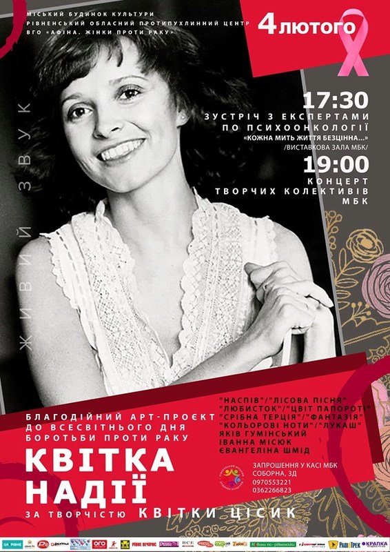 Коли вона співала хтось вчував у її тембрі скрипку, хтось називав це унікальним колоратурним сопрано, а ми знаємо, що так звучить сама Україна. Народившись і проживши все життя в США, вона зробила більше ніж будь-хто інший, аби українську пісню чули за океаном. Два україномовні альбоми, видані за власний кошт – «Квітка» (1980) і «Два кольори» (1989), вона записала з найкращими музикантами Нью-Йорка, а в Україні її слухали підпільно. Справжня слава Квітки тут, на теренах нашої країни, прийшла після її смерті. Рано не стало Квітослави, у віці 45-ти років. Жінку підкосила страшна хвороба – рак молочної залози, який у неї виявили в 1992 році. Лікарі їй сказали, що проживе кілька місяців, а вона прожила сім років, продовжуючи наполегливо і натхненно творити музику. Боротьба за життя за допомогою улюбленої справи, крізь власну творчість, яка здатна лікувати і підіймати на ноги, коли вже здається сил немає… Саме цій самовідданій, унікальній співачці Міський Будинок Культури присвячує свій новий благодійний арт-проект «Квітка надії». Відбудеться захід 4 лютого, у Всесвітній день боротьби проти раку, аби нагадати усім нам про важливе, про силу духу, аби допомогти знайти підтримку для тих, хто цього потребує. І звісно, щоб вшанувати пам’ять видатної співачки. Проєкт ми організовуємо спільно з Рівненським обласним протипухлинним центром, ВГО “Афіна. Жінки проти раку” та за підтримки міського голови Володимира Хомка. У програмі проєкту на вас чекає: благодійний ярмарок майстрів студії декоративно-ужиткового мистецтва у фойє МБК; зустріч у виставковій залі з експертами по психоонкології “Кожна мить життя безцінна…”, де кваліфіковані онкологи та психологи говоритимуть про те, як зібратися з силами і боротися проти хвороби (початок о 17:30 год, вхід вільний). А вже ввечері, о 19:00 год, розпочнеться вечір пісні Квітки Цісик.