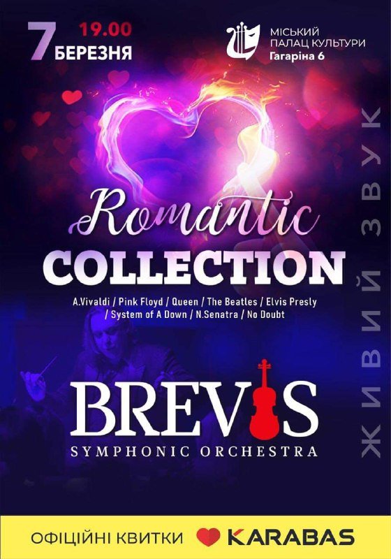 Життя лише тоді знаходить колір, коли його торкаються ніжні пальці Любові вираженій у музиці! Тож дозвольте весні увійти у Ваше життя з романтичними нотами A.Vivaldi / Pink Floyd / Queen / The Beatles / Elvis Presly / System of A Down /N.Senatra / No Doubt / у майстерному виконанні легендарного симфонічного оркестру Brevis!