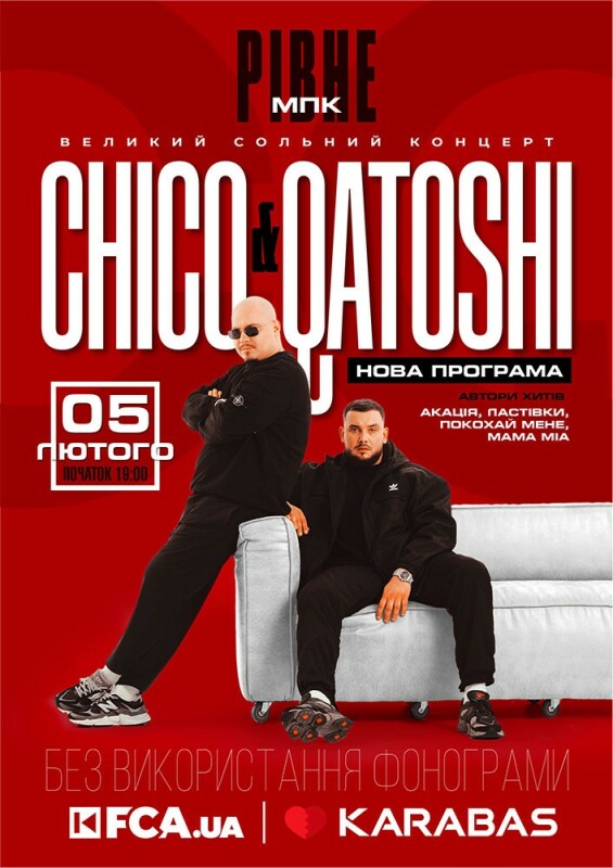 Вже зовсім скоро Chico & Qatoshi дають свій сольний концерт у вашом місті , де разом з вами заспівають улюблені хіти та нові пісні.