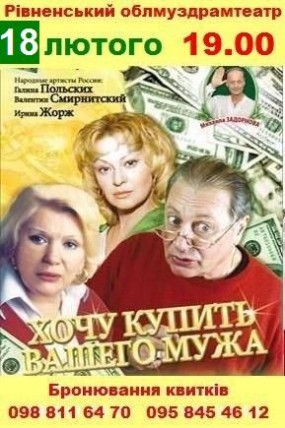 Легка і світла комедія про мінливість кохання з несподіваними поворотами сюжету і неочікуваним фіналом за п’єсою Михйла Задорнова на сцені Рівненського облмуздрамтеатру 18 лютого. Квитки за телефоном 098 811 64 70, 095 845 46 12
