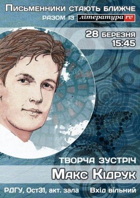 - натомість запрошуємо вас на відкритий творчий вечір Макса Кідрука, який розпочнеться того ж дня о 19.00 і буде відбуватися в КУЕМі (вхід з двору 15 школи; вул. Пушкіна, 17). Програма заходу залишається незмінною, як і теми обговорення (включно із книгами «Навіжені в Мексиці», «Любов і піраньї», «Бот»)]