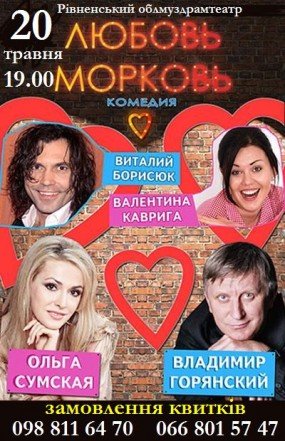 20 травня в Рівненському облмуздрамтеатрі народні артисти України Володимир Горянський та Ольга Сумськая, артисти Віталій Борисюк та Валентина Коврига в комедії "Любовь-морковь".