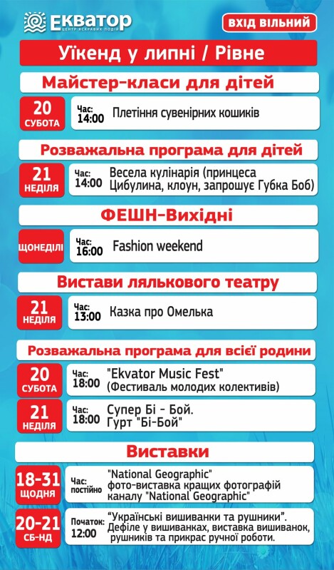- 21.07 о 13.00 – вистава лялькового театру «Казка про Омелька» (головна сцена ТРЦ Екватор).