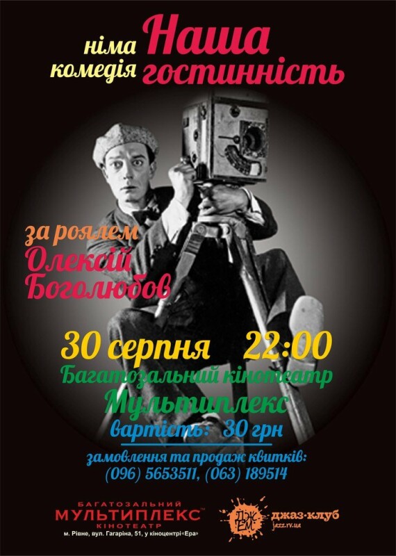 Перегляд американської німої комедії 1923 року з Бастером Кітоном "Наша гостинність" у джазовому супроводі відомого піаніста Олексія Боголюбова.
