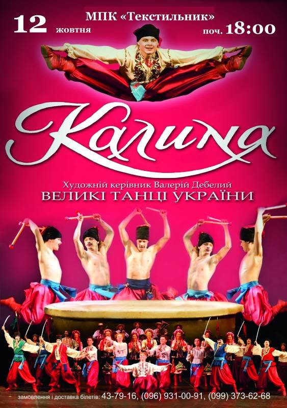 Ансамбль «Калина» - лауреат багатьох міжнародних та всеукраїнських конкурсів і фестивалів, якому аплодували глядачі Іспанії, Голландії, Бельгії, Німеччини, Китаю, Кореї, Індонезії, Чилі, Єгипту, Ізраїлю, Італії та багатьох інших країн світу, - запрошує на свої концерти.