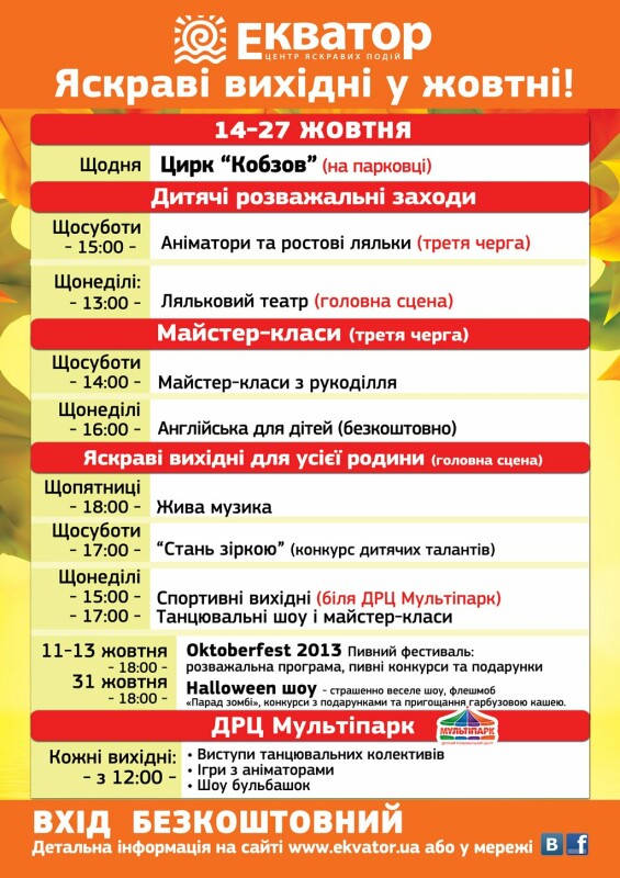 - 11-12.10 о 18.00 – святкування Оctoberfest: розважальна програма, розіграші (головна сцена ТРЦ Екватор).