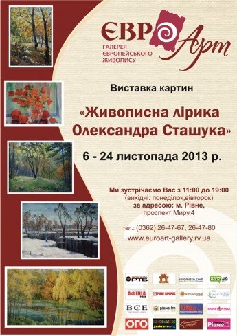 Галерея європейського живопису «Євро-Арт», засвідчуючи повагу педагогові, презентує нову виставку художника «Живописна лірика Олександра Сташука». В експозиції представлено понад сорок полотен, що написані автором у 2000-2013 рр. «Вони демонструють відданість живописця реалістичній манері письма, - зазначає куратор галереї Лариса Костюк, - і виражають його творчі пошуки у смисловому полі образотворення. Митець, усвідомлюючи божественність краси повсякдення, виплескує на полотно пейзажні барви настільки продумано, що створений ним художній образ природи Волині постає у всій повноті та плинності». У роботах останніх років по-особливому прописується небесний простір («Тихий вечір над Іквою» 2013 р., «Весна над Хрінницьким озером» 2013 р.), надзвичайно правдиво передається стан природи у конкретну мить («Сріблястий ранок» 2011 р., «Пробудження» 2013 р.), живописно звучать ліричні барви природи («Світе тихий, краю милий» 2013 р., «Біля Городоцьких святинь» 2013 р.) та ін. Презентовані роботи Олександра Сташука викликають у глядача рефлексію причетності кожної людини до того куточка української землі, де він народився чи живе. Виставка в цілому ставить проблему краси рідного краю та необхідності її збереження для прийдешніх поколінь.