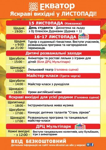 - 16.11 о 17.00 – Конкурс дитячих талантів «Стань зіркою» (головна сцена ТРЦ Екватор).