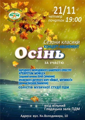 Осінь проводжаємо класичною музикою. У глядацькій залі Рівненського ПДМ відбудеться концерт-абонемент "Сезони класики. Осінь". Запрошуємо усіх шанувальників музичної творчості.