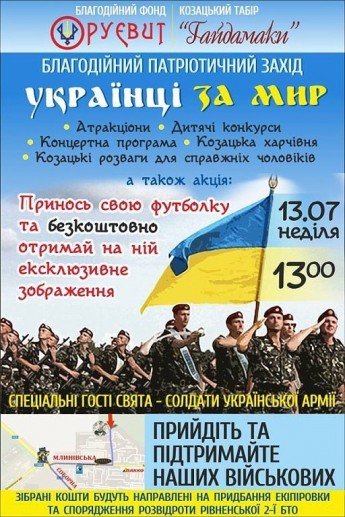У неділю, 13 липня о 13.00, в козацькому таборі “Гайдамаки” (вул.Млинівська) відбудеться благодійний патріотичний захід “Українці за мир”. На гостей акції чекають атракціони, дитячі конкурси, концертна програма, козацька харчівня та козацькі розваги для справжніх чоловіків.