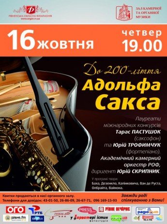 До 200-ліття Адольфа Сакса – лауреати міжнародних конкурсів Тарас Пастушок (саксофон) та Юрій Трофимчук (фортепіано). Академічний камерний оркестр РОФ, диригент Юрій Скрипник.