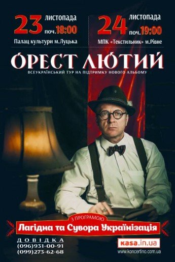 Орест Лютий з програмою "Лагідна та Сувора Українізація"!!!Всеукраїнський тур на підтримку нового альбому. Сльози і сміх, глибокі емоції та переживання, переосмислення багатьох історичних фактів, озвучення актуальних проблем сьогодення в музичній формі радикального арт-кабаре — ось що мусять побачити і почути всі щирі патріоти України!