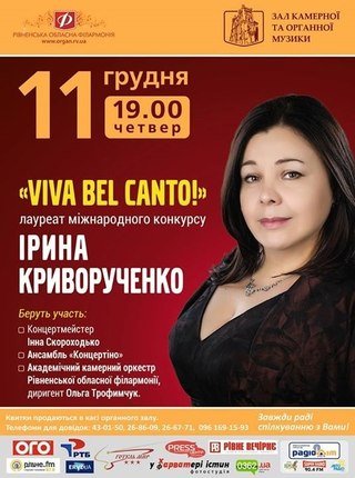 «Viva bel canto!» - Концерт лауреата міжнародного конкурсу Ірини Криворученко, концертмейстер Інна Скороходько, Академічний камерний оркестр РОФ, диригент Ольга Трофимчук.