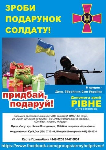 - Збір коштів солдатам (приносити на склад ДАР - Кн. Володимира, 108).