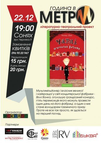Година в МЕТРо» - платформа для взаємодії літературного і театрального, цікавих книг й акторської майстерності. На заході аматорські та професійсні актори читатимуть для вас уривки з повісті Рональда Дала "Чарлі і шоколадна фабрика".