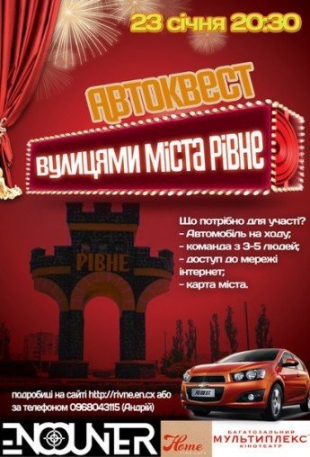 Автоквест (або точки) - захоплююче-пізнавальне автомобільне орієнтування.Брифінг розпочнеться 23 січня (п'ятниця) о 20:30 на місці старту. Місце старту: парковка біля ЦНТІ (вїзд до Авангарду з вулиці Замкової)
