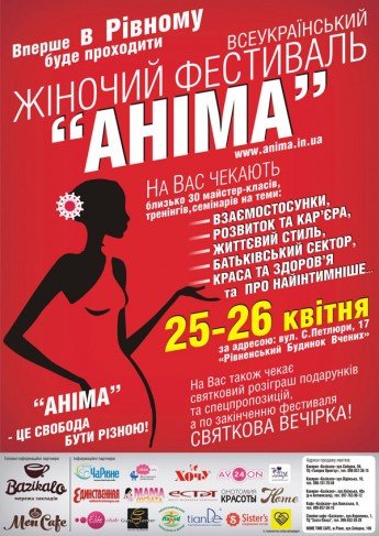 Взаємостосунки та кар’єра, розвиток та стиль життя, краса та здоров’я, батьківство та найінтимніше. Жіночий фестиваль Аніма — це подія, що змінює життя жінки на краще. Хочеш знати, як бути щасливою з чоловіком або вийти заміж? Всі відповіді на Жіночому фестивалі АНІМА у Рівненському будинку вчених (м. Рівне вул. С .Петлюри.17) тільки 25 та 26 квітня.