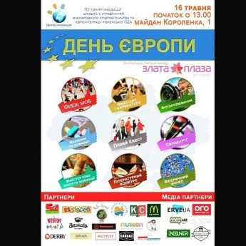 З 12.00 до 16.00 на площі Короленка буде функціонувати «європейське містечко», де волонтери будуть поширювати інформаційно-презентаційні матеріали про Європу.