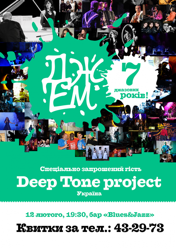 Ми запрошуємо Вас на святкування свого сьомого дня народження! 12 лютого 2016 року о 19-30, в барі – ресторані "Блюz & Jazz" гратимуть одні з найкращих джазменів України, квартет "Deep Tone project". Deep Tone - глибокий погляд на сучасну музику, де jazz переплітається з елементами класики, Contemporary Jazz та ECM.
