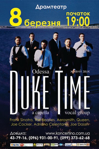 Група DukeTime (ДюкТайм) – чоловічий вокальний секстет – утворилася в серпні 2004 року в Одесі. Теперішній склад групи функціонує з лютого 2005 року і до нього вхо-дять шість професійних вокалістів: бас, три баритони и два тенори. Направленння, у яко-му працюють музиканти – виключно a capella.