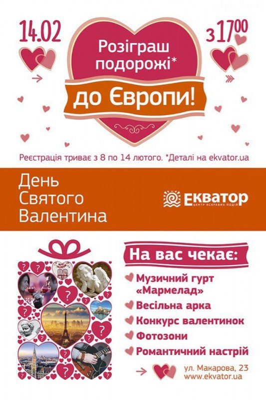 3. 14.02.2016р. о 19:00 отримай можливість виграти гловний приз - Подорож о Європи від "Coral Travel", а також багато іших подарунків.