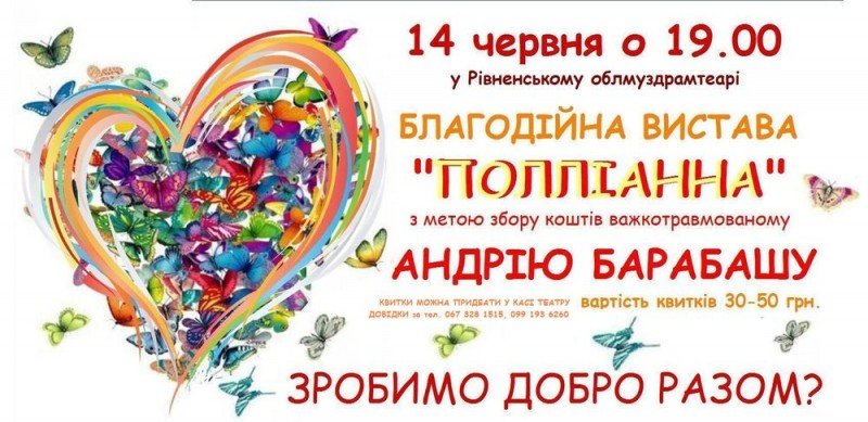 14 червня о 19.00 у нашому театрі відбудеться благодійний показ вистави "Полліанна". Цього разу з метою збору коштів для Андрія Барабаша. 22-річний мешканець села Заріцьк Рівненського району вже більш, ніж півроку безмірно страждає від важкої травми та й лікарі кажуть, що чудо, що взагалі залишився живий. Хлопець вже переніс вісім операцій і потребує наступної, яка вартує близько 25 тисяч гривень.