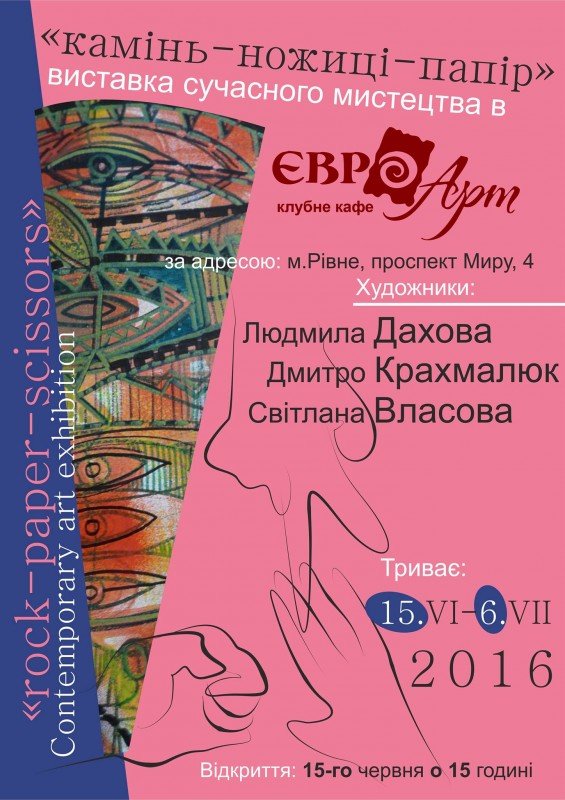 Суть події. Нова експозиція під назвою «Камінь-ножиці-папір» у клубному кафе «Євро-Арт» об’єднує творчу діяльність трьох рівнян – Людмили Дахової, Світлани Власової та Дмитра Крахмалюка.