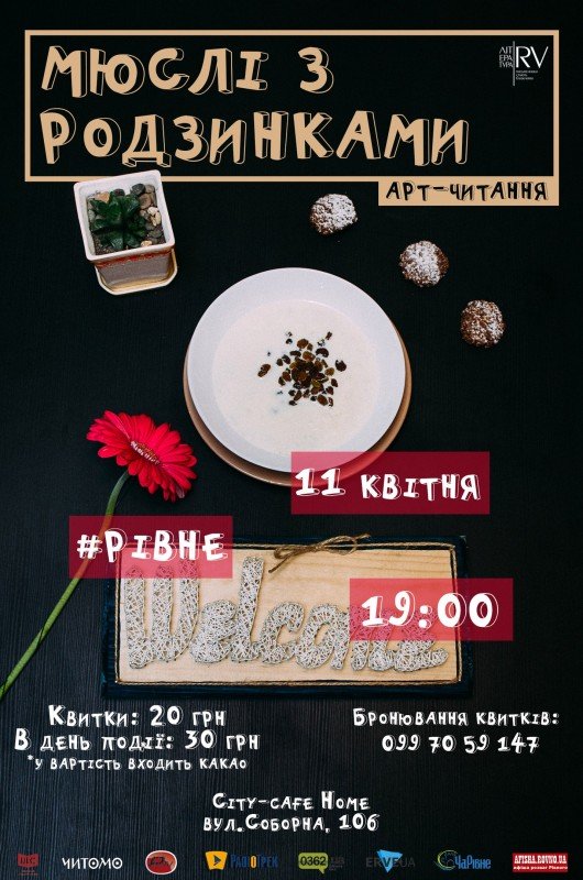 Організація “Література.РВ” запрошує на арт-читання, що мають назву “Мюслі з родзинками”. Учасниками стануть молоді рівненські автори, які читатимуть свої поетичні тексти для зацікавлених слухачів. Подія відбудеться 11 квітня о 19:00 у city-cafe “Home” (вул. Соборна, 106).