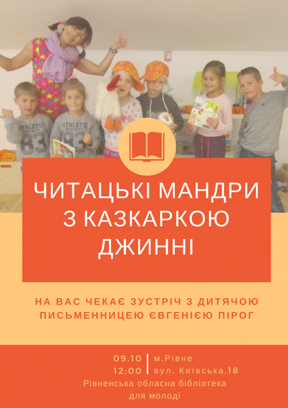 У понеділок, 9 жовтня о 12.00 в відділі сімейного читання Рівненської обласної бібліотеки для молоді (вул., Київська, 18) відбудеться творча зустріч з відомою українською дитячою письменницею Євгенією Пірог «Читацькі мандри з казкаркою Джинні».