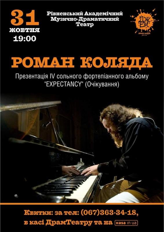 Джазовий клуб "ДжЕм" запрошує! 31 жовтня 2017 року, о 19:00, в Рівненському Музично – Драматичному Театрі відбудеться презентація четвертого сольного фортепіанного альбому диякона, піаніста-імпровізатора, журналіста, радіо та телеведучого, поета Романа Коляди, що носить назву «Expectancy» (ОЧІКУВАННЯ).