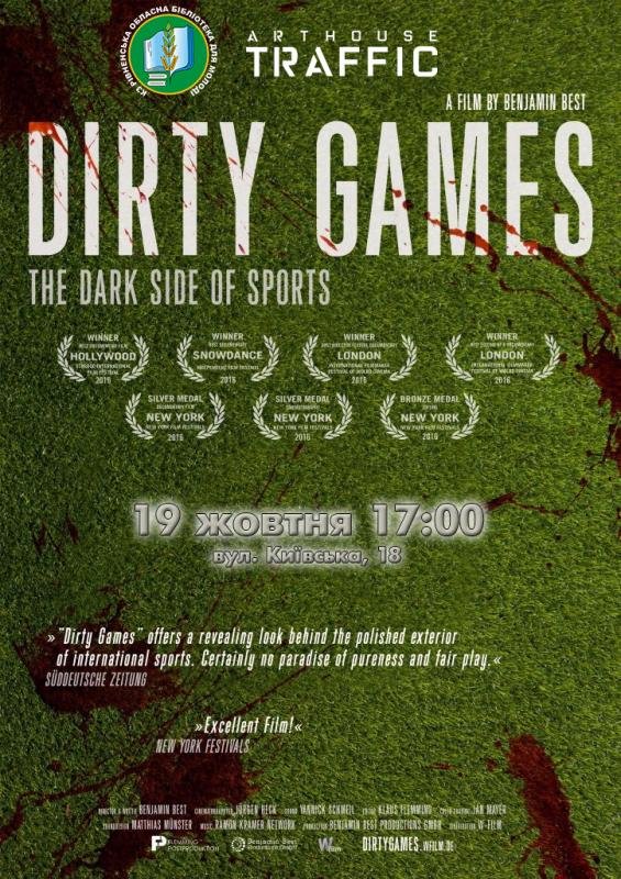 У четвер, 19 жовтня, о 17.00 в Рівненській обласній бібліотеці для молоді (вул. Київська, 18) відбудеться перегляд спортивного документального фільму «Брудні ігри» (Німеччина, 2016) режисера і журналіста Бенджаміна Беста. Це розслідування про порушення прав людини у контексті великих спортивних заходів, а також корупційні схеми у футболі, боксі та в американській професійній баскетбольній лізі NBA. «Брудні ігри» отримали призи за найкращу документальну стрічку, найкращу операторську роботу та найкращий монтаж на кінофорумах у Голлівуді, Лозанні, Лондоні, Мілані, Нью-Йорку та інших.