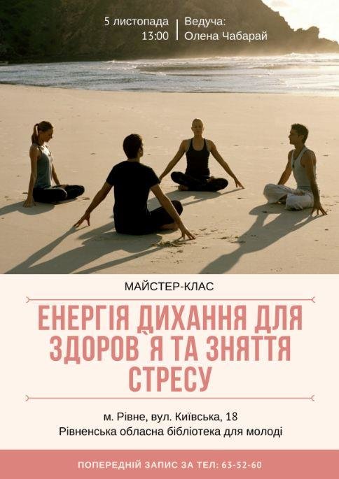 У неділю 5 листопада, о 13.00 в Рівненській обласній бібліотеці для молоді (вул. Київська, 18) відбудеться безкоштовний майстер-клас «Енергія дихання для здоров`я та зняття стресу», який проведе спеціаліст з тілесно орієнтованих та дихальних практик Олена Чабарай.