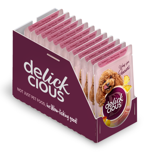Щоб вибрати правильний додатковий вологий корм, варто ознайомитись з запропонованими смаками. У лінійці Delickcious пропонується два варіанти – пластівці з індичкою та тропічними фруктами у вершковому соусі або пластівці з ягнятиною та лісовими ягодами у вершковому соусі.