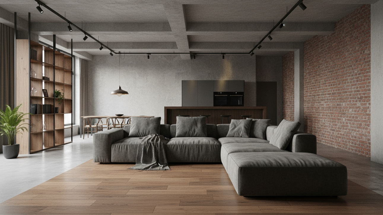 У лофті меблі перестають бути просто предметами обстановки та беруть на себе архітектурну функцію формування простору. Замість традиційного розташування вздовж стін тут панує «острівний» принцип, за якого функціональні групи (диванна, обідня, робоча) формуються в центрі відповідних зон. Цей підхід не лише підкреслює відкритість, але й сам створює візуальні кордони. Великий модульний диван, розвернутий спинкою до кухні, фізично та візуально відділяє зону відпочинку. Високий стелаж без задньої стінки слугує напівпрозорою межею між вітальнею та кабінетом, а лаконічна барна стійка чітко розмежовує кухню та їдальню, не порушуючи при цьому єдності простору.
