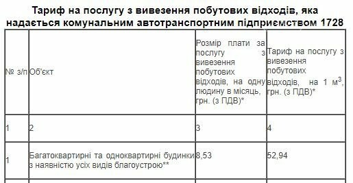 У Рівному встановлюються нові тарифи на вивезення сміття. За попереднім підрахунком мешканці багатоквартирного будинку сплачуватимуть 15 гривень 77 копійок з однієї особи, за місячний період. Новоухвалений тариф є майже у двічі більшим за попередню вартість, що становила 8, 53 гривень. Жителі індивідуальних будівель, за новими тарифами витрачатимуть 18, 43 гривні за особу.