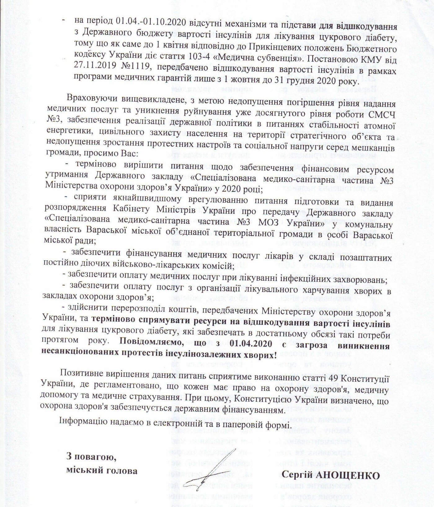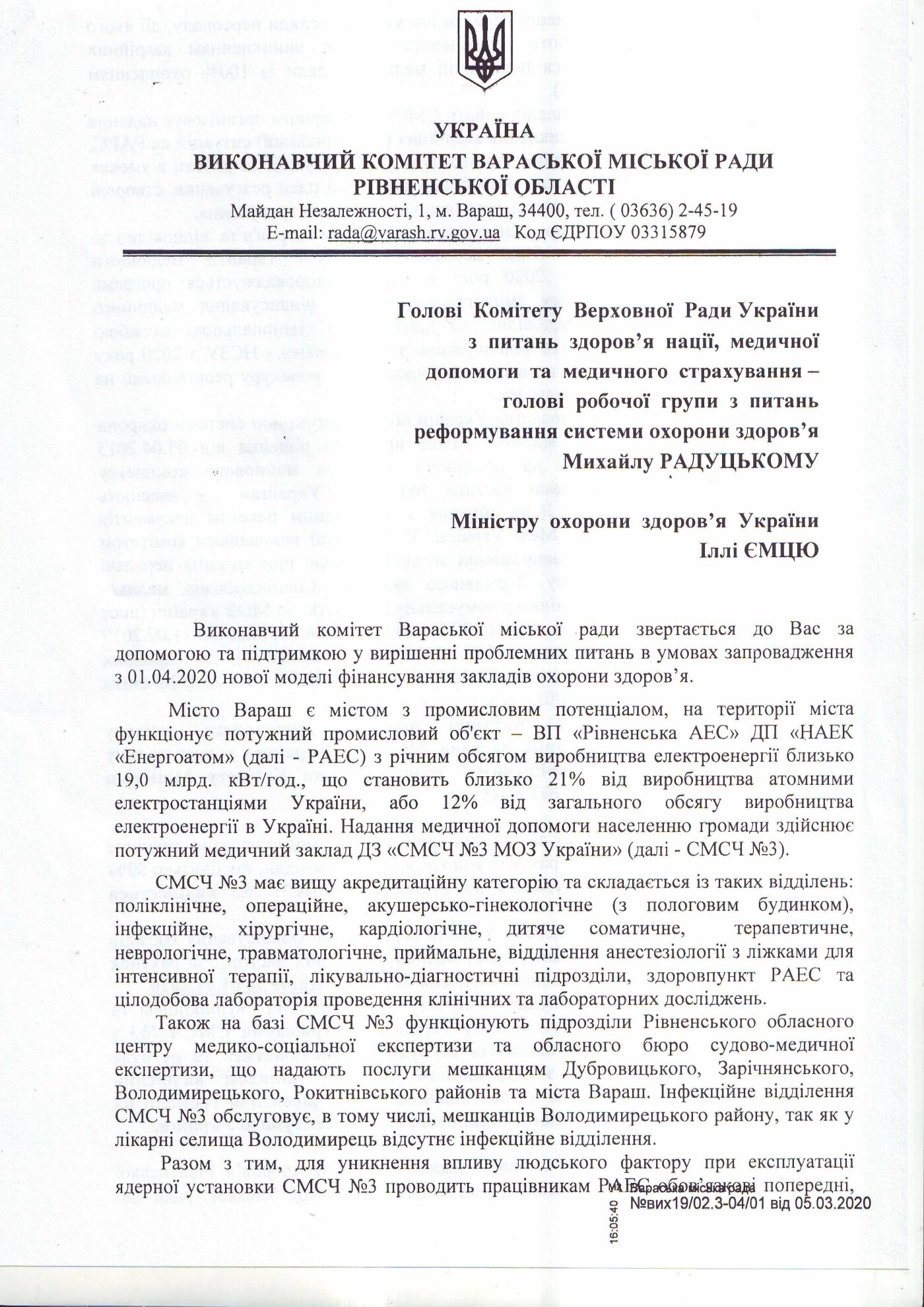 Враховуючи вищевикладене, з метою недопущення погіршення рівня надання медичних послуг та уникнення руйнування уже досягнутого рівня роботи СМСЧ №3, забезпечення реалізації державної політики в питаннях стабільності атомної енергетики, цивільного захисту населення на території стратегічного об’єкта та недопущення зростання протестних настроїв та соціальної напруги серед мешканців громади,виконавчий комітет Вараської міської ради вкотре звернувся до Комітету Верховної Ради України з питань здоров’я нації, медичної допомоги та медичного страхування та Міністра охорони здоров’я України з вимогою: